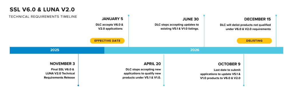 The DLC will update the new Technical Requirements periodically, and each update will be recorded in the document in Part VIII: Policy Clarifications and Updates in Table 40: SSL V6.0 and LUNA V2.0 Technical Requirement Corrections and Clarifications.