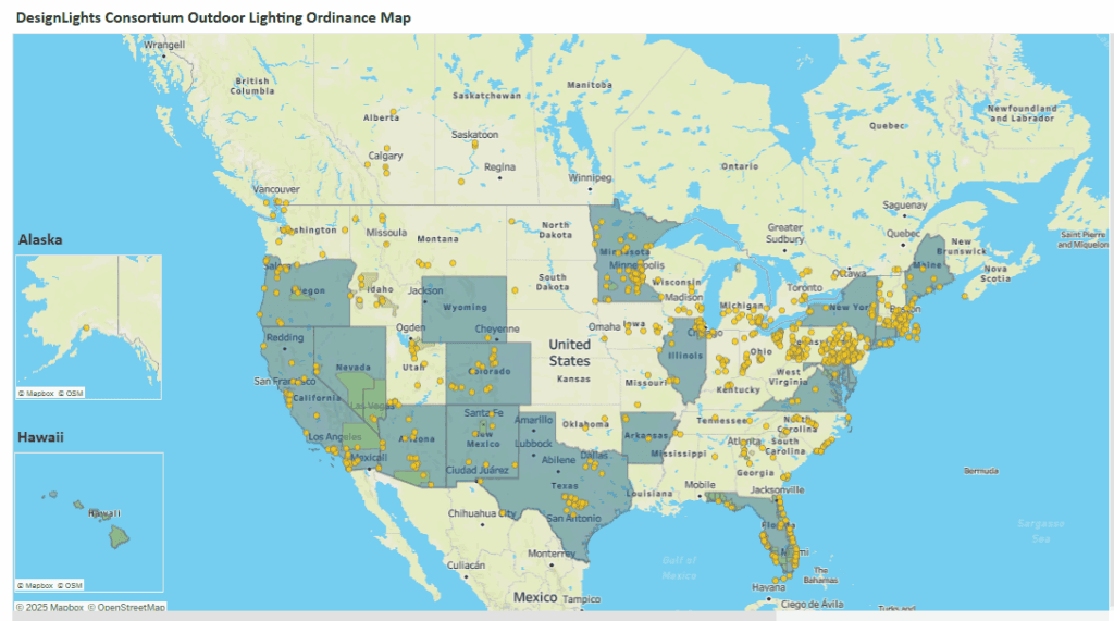 Local regulations designed to mitigate outdoor light pollution are popping up across the US and Canada. So far, the DLC has mapped nearly 950 communities and counties in 53 provinces and states (plus the District of Columbia) where local authorities have enacted outdoor lighting ordinances or bylaws. Add the many hundreds more ordinances that exist but aren’t yet mapped, and that’s a huge swath of the continent where city and town planners, municipal procurement staff and other public officials are charged with ensuring that the outdoor lighting they select and install doesn’t mar the night sky for residents and the local environment