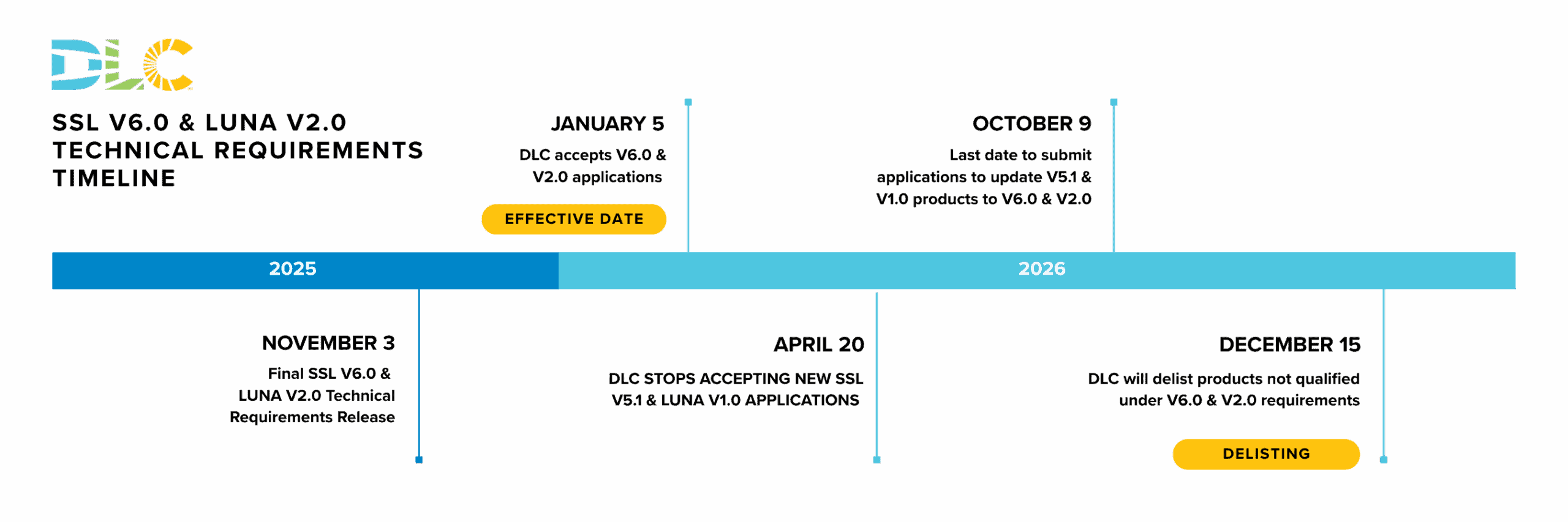 The DLC recognizes that the SSL V6.0 and LUNA V2.0 Technical Requirements result in the need to provide additional product information and potentially perform new testing and/or product design changes to maintain DLC qualification.